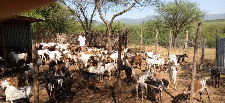 There are three different breeds of goats; the small East African goat, the Galla goat and the cross breed of Galla and the small East African goat. The goats get to be auctioned after every two years. Since the area is prone to prolonged drought, the number of has been kept to the carrying capacity of the rangeland.
