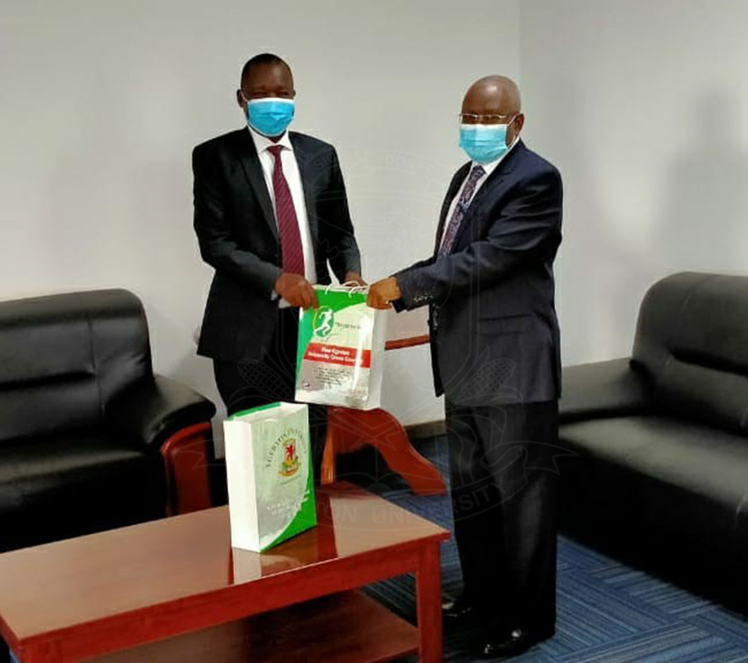 • Egerton University’s Ag. Vice-Chancellor Prof. Isaac O. Kibwage (right) on 15 February 2021 paid a courtesy call to Eng. Philemon Kandie (left), Ag. Director-General, Kenya Rural Roads Authority (KeRRA) at Barabara Plaza, Nairobi.