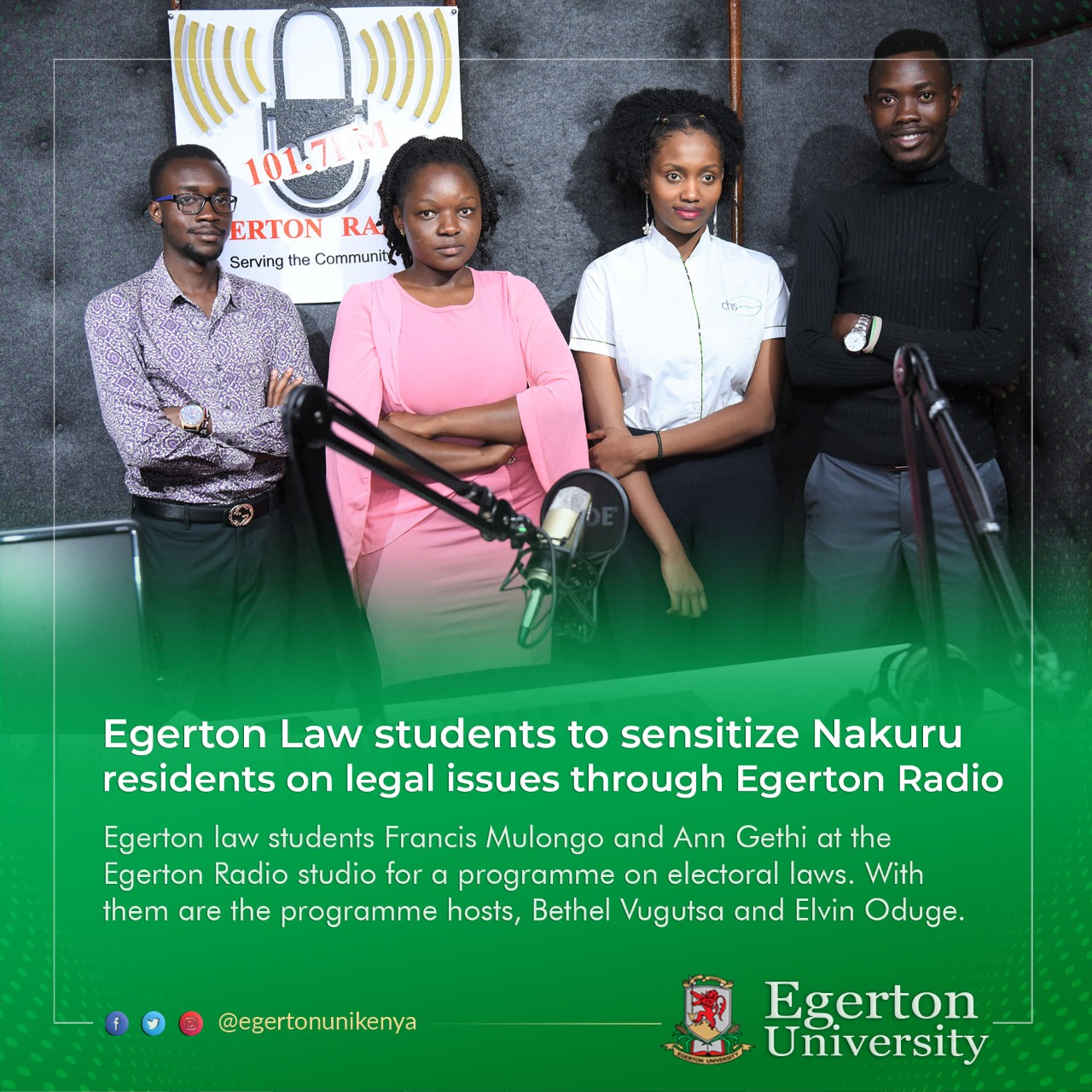 • Egerton University Law students will sensitize Nakuru residents on legal issues through Egerton Radio (101.7 FM).