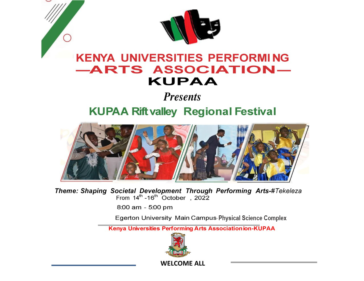 The Kenya Universities Performing Arts Association (KUPAA) organizes the KUPAA Rift Valley Regional Festival. The theme is 'Shaping Societal Development Through Performance Arts'.