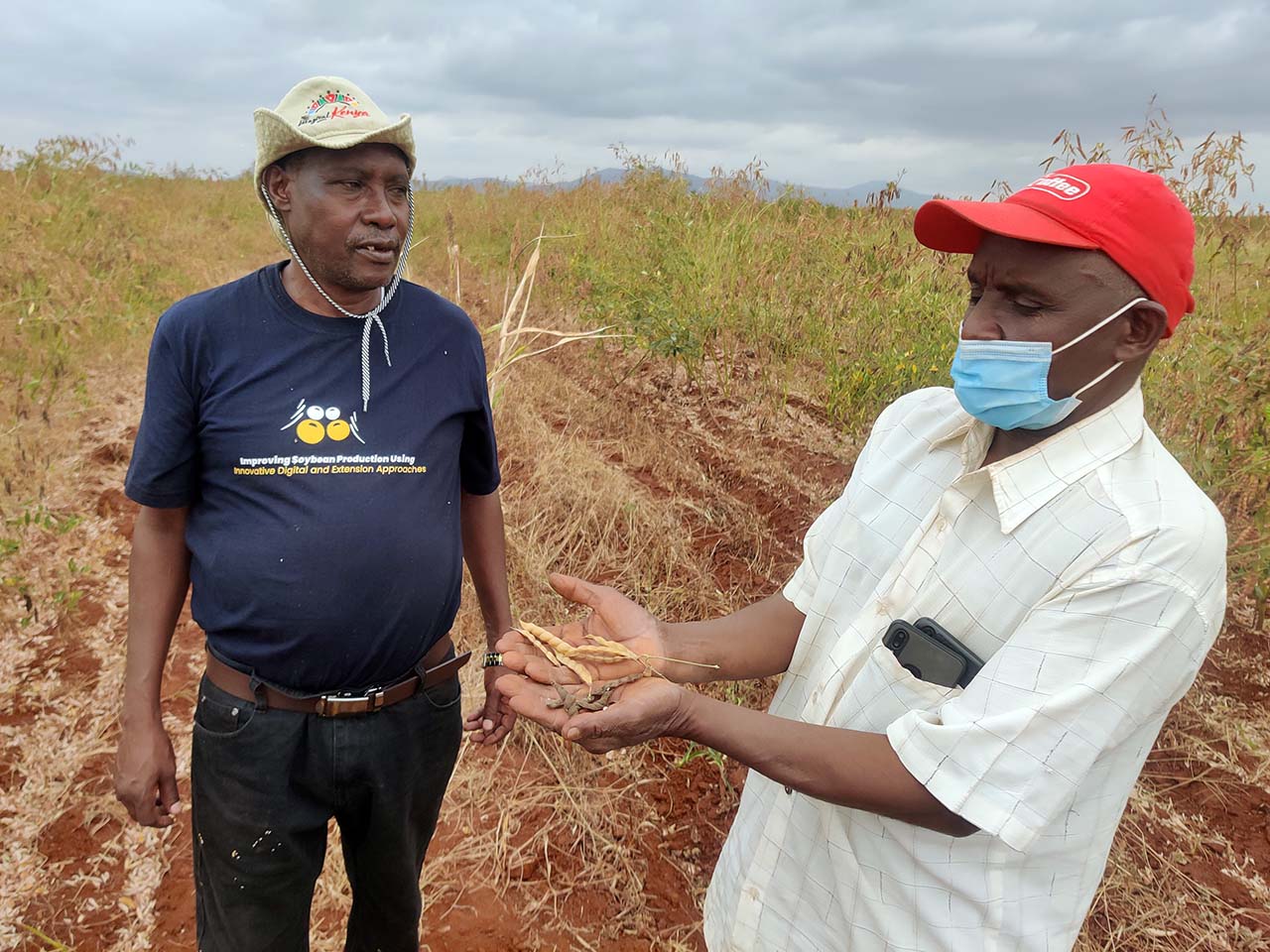 Mr Bernad Towett, a senior agronomist and seed system specialist (on the right), is with Mr John Musyoki (on the left), a farmer contracted by Egerton University to grow the improved pigeon pea seed variety (Egerton Mbaazi 3). Mr Towett noted that the enhanced seed variety produced a higher yield when compared to the traditional local pigeon peas.