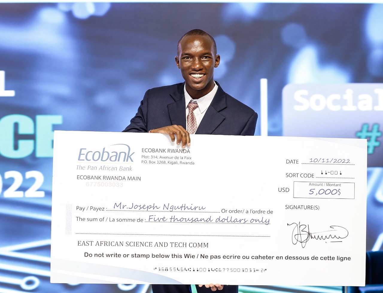 Nairobi,10 November 2022: Joseph Nguthiru, a student in the Department of Civil and Environmental Engineering at Egerton University, is the winner of the Presidential Award for Kenya in the East African Youth Innovation Forum.