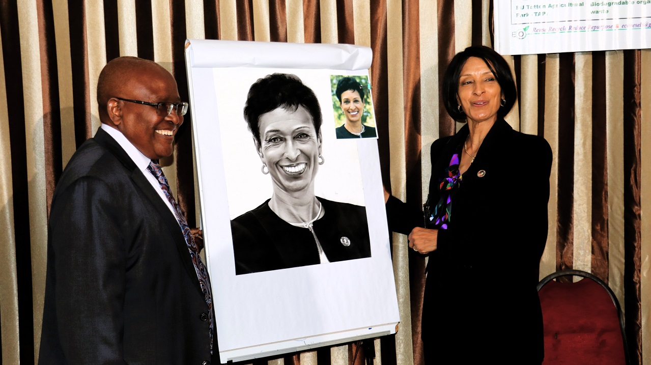 The President of Bowie University was taken to an exhibition of innovations within the University and got a portrait of herself drawn through by pencil using a device innovated by one of the students.