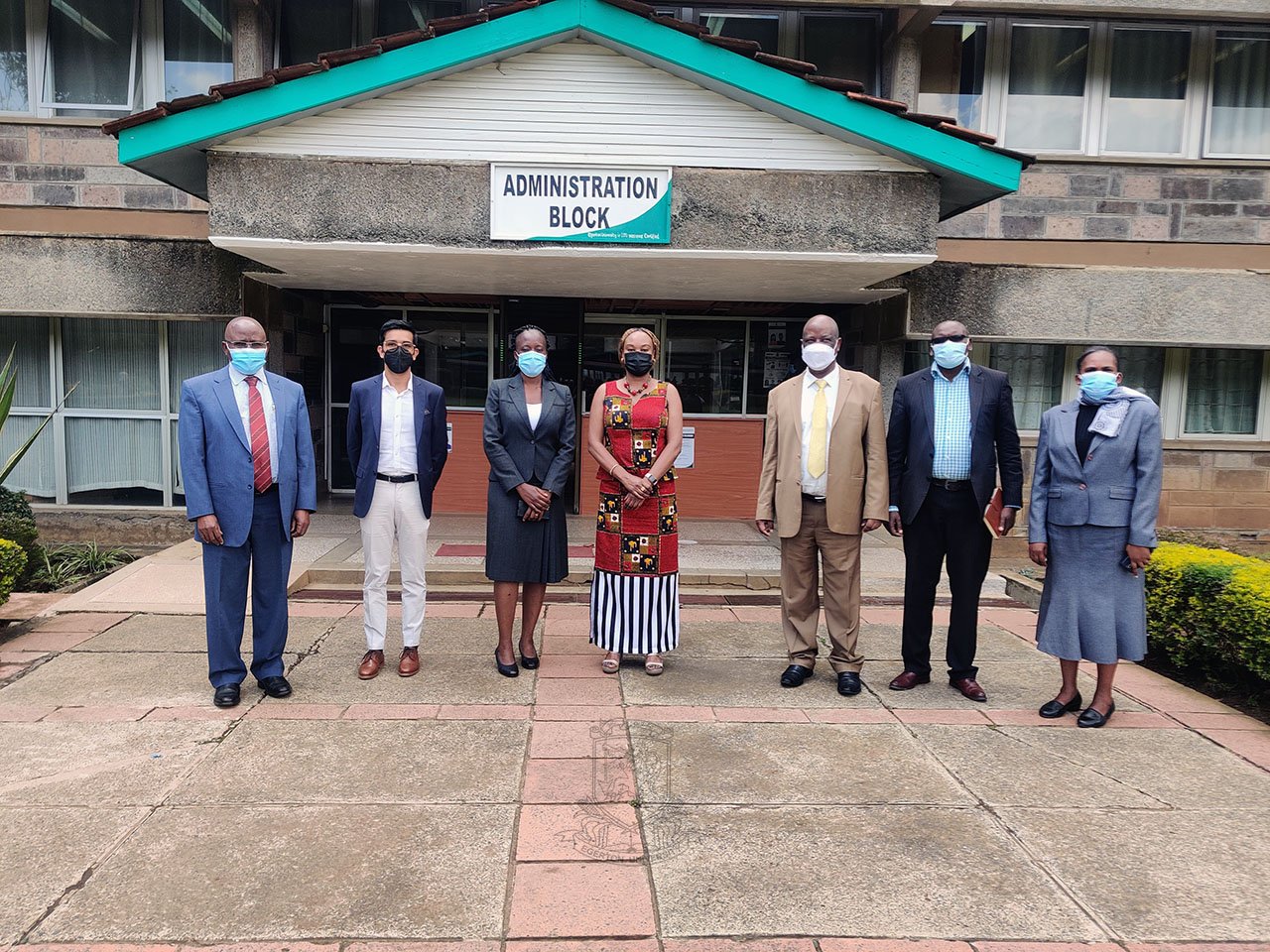 Members of the Strengthening Urban Resilience in Food and Nutrition Security (SURE) project in Kenya held a meeting with the Egerton University team on 17 September 2021 at Main Campus, Njoro. From the left is the acting Vice-Chancellor Prof. Isaac Kibwage, Co-Principal Investigator and a researcher at the University of Hohenheim in Germany Dr Hamid Reza Oskorouch, Egerton University researcher Dr Lydiah Waswa, Principal Investigator and University of Nairobi researcher Dr Catherine Kunyanga, acting Deputy Vice-Chancellor (Research and Extension) Prof. Bockline Bebe, Director Marketing and Resource Mobilization Prof. Paul Kimurto and Chairperson of the Department of Human Nutrition Dr Stellamaris Muthoka.