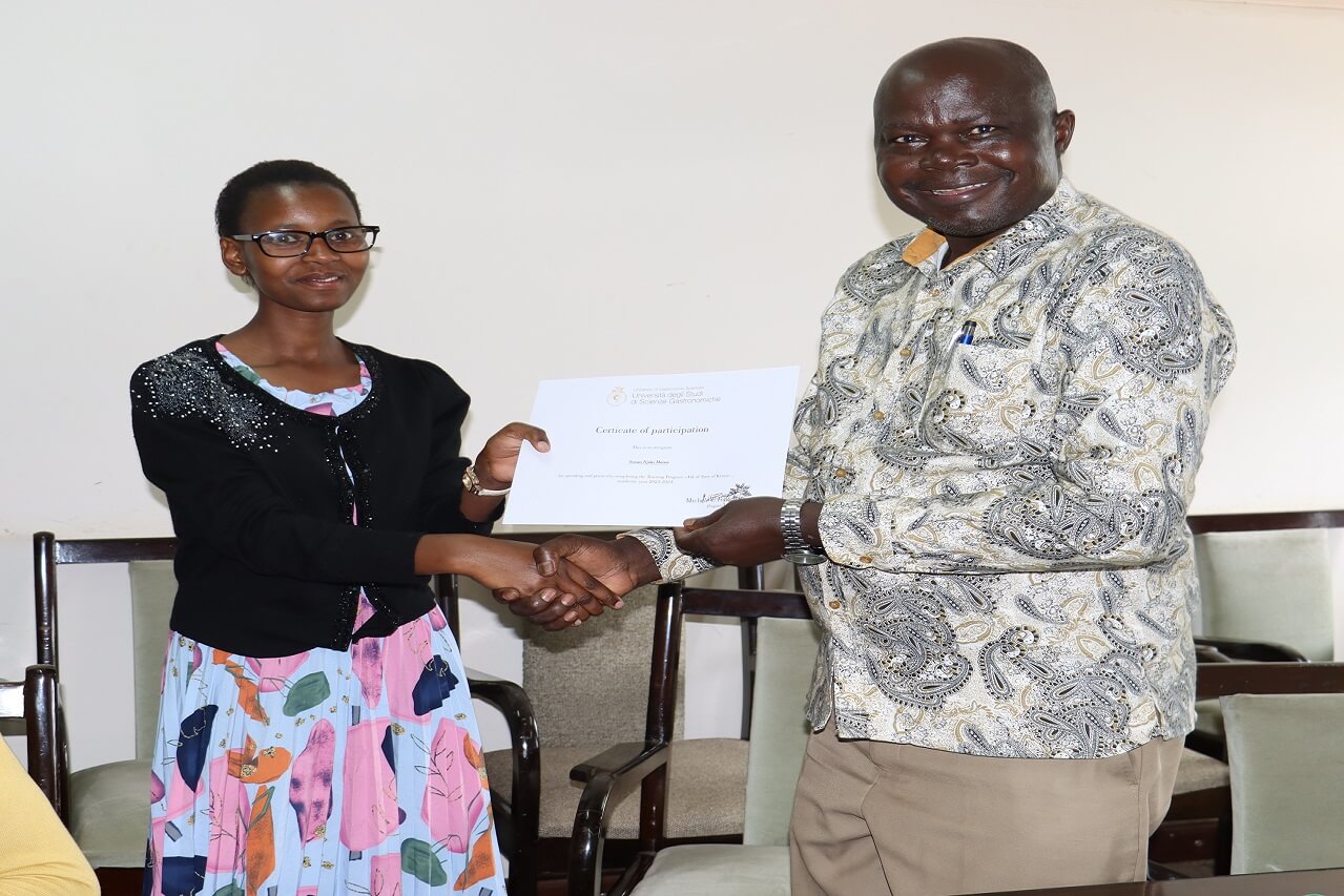 Prof. Joshua Ogendo and Dr. Stellamaris Muthoka with Egerton University students after training on training on documenting traditional foods in Kenya at Main Campus on April 19th. It was at this event that the students were awarded certificates. The ceremony was graced virtually by Prof. Michele Filippo Fontefrancesco of the University of Gastronomic Sciences in Italy.