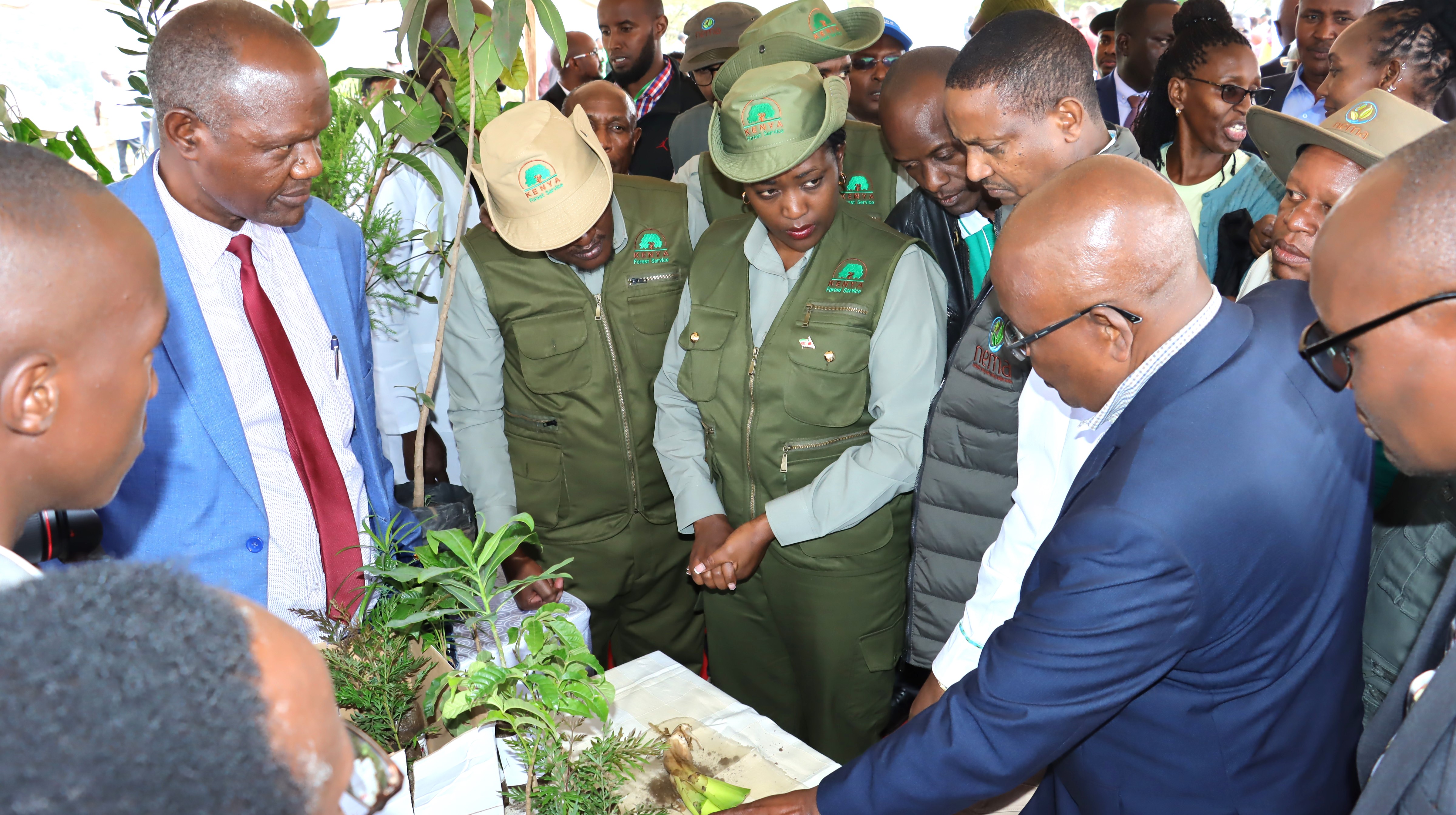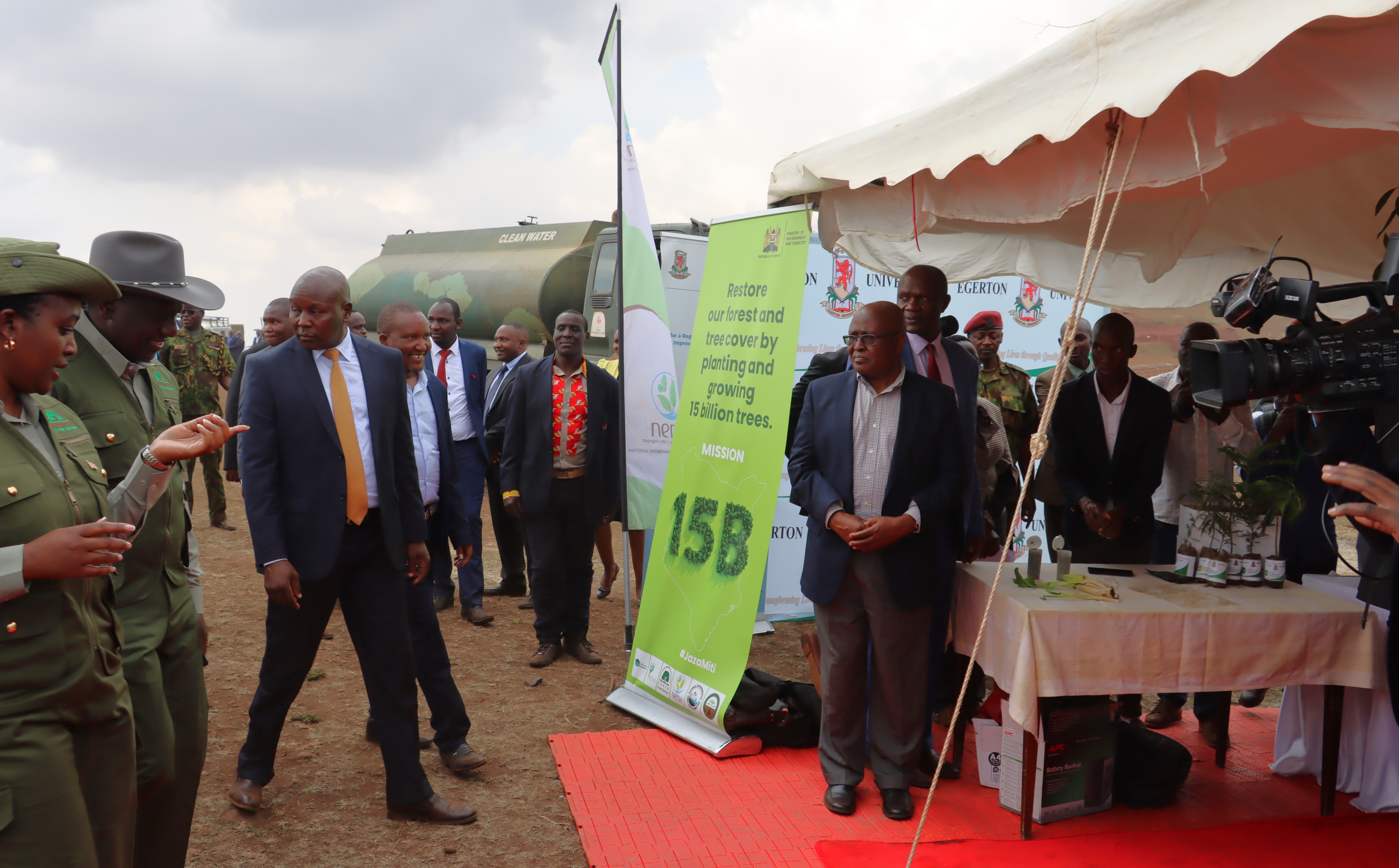 Accompanying President William Ruto, the Cabinet Secretary Environment and Forestry Hon Soipan Tuya arrived at the launch of the 15 Billion Trees Campaign christened Mission15B #JazaMiti at Kona Baridi, Ngong Hills Forest Block in Kajiado County received by PSs Ephantus Kimotho and Eng. Festus K Ng'eno. They visited the Egerton booth.